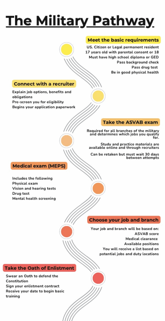 Joining the military has become a streamlined process in this modern age. After you pass some basic requirements, you’ll need to take an exam to determine what jobs you can qualify for. If you want a specific job and don’t qualify for it after taking the exam you can take the test again 30 days afterwards. When you’re satisfied with your score, you will need to take a medical exam to see if you can be put into active duty. Depending on all the information received by the prior steps you can then choose your job and branch before you take your oath and sign your enlistment contract.