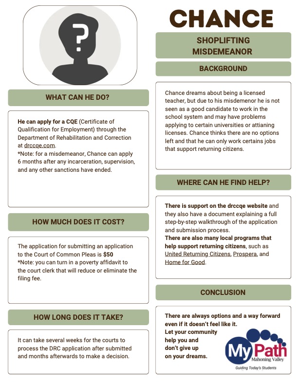 Lets follow the story of Chance to the left. Chance has a conviction for a misdemeanor, which can ruin his chances of getting licensing or off-put schools or employers to accept him for a position. Chances best option is to apply for CQE as soon as he can to seal his record.